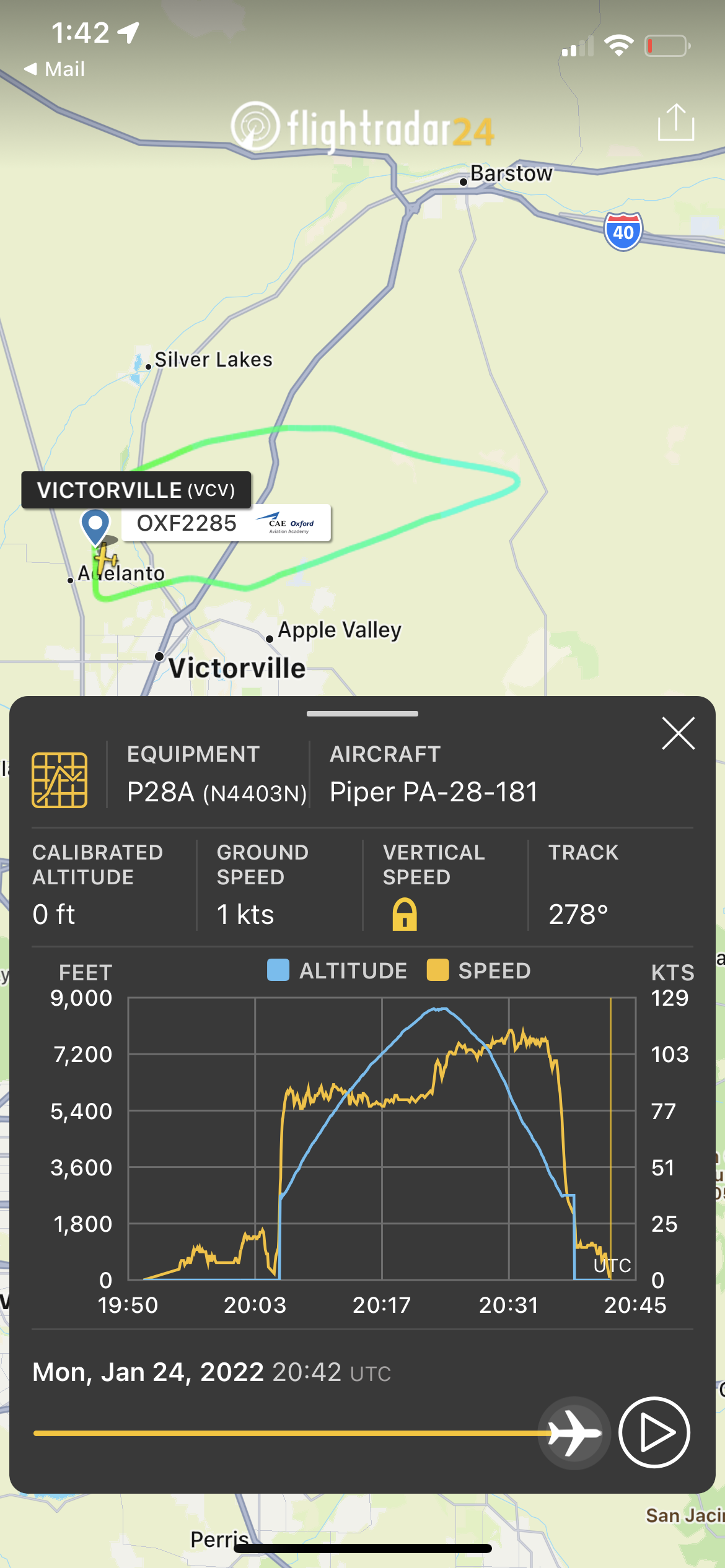 | OXF22854) | January 24, 2022 | N4403N | Oxford Aviation Academy | Piper PA-28-181 | Southern California Logistics Airport (VCV) | Southern California Logistics Airport (VCV) | View flight map |
